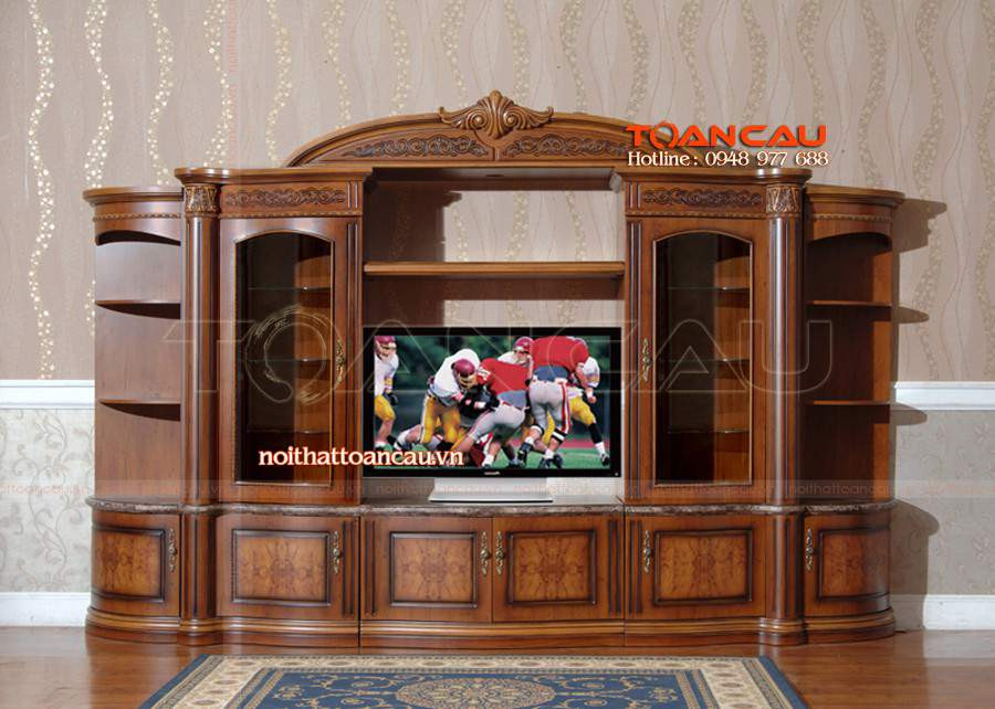 Với gia chủ có thích phần tủ rượu và tủ trưng bày lớn thì mẫu kệ tivi kết hợp tủ rượu gỗ óc chó này là tối ưu nhất khi có 2 tủ lớn đối xứng 2 bên, giúp tối ưu không gian lưu trữ rượu, cốc ly, tặng phẩm...