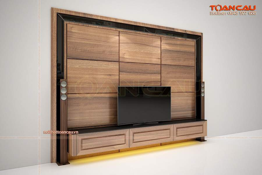 Khung gỗ ốp tường có phối nu gỗ óc chó kèm đèn hắt sáng tôn lên vẻ đẹp cho phần kệ tivi gỗ và giúp không gian phòng khách trang trọng hơn