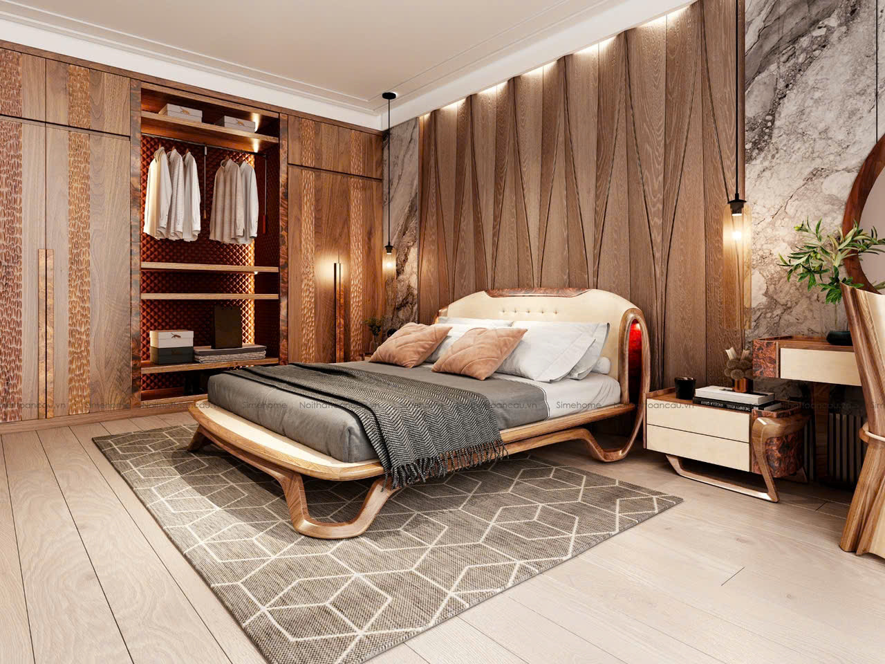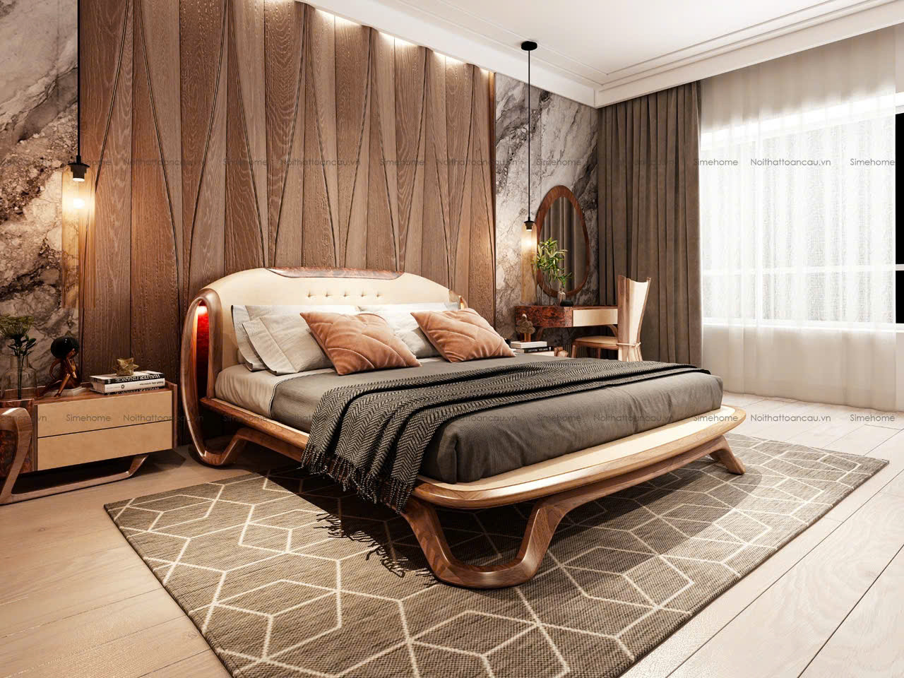 Phối nu gỗ óc chó tinh tế ở các chi tiết đầu giường và thành giường, tăng thêm vẻ đẹp sang trọng và đẳng cấp cho tổng thể sản phẩm. -