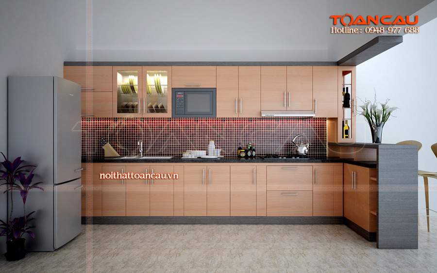 Kiểu tủ bếp cao cấp hình chữ L đang là món đồ được yêu thích, màu sắc nâu nhạt ấm áp hơn khi sử dụng. Sự tiện lợi và hiện đại phục vụ cho việc nấu nướng của các bà nội trợ một cách tốt hơn, nhất là trong đại hiện nay họ không chỉ đảm đương việc nội trợ mà còn tham gia các công tác xã hội.